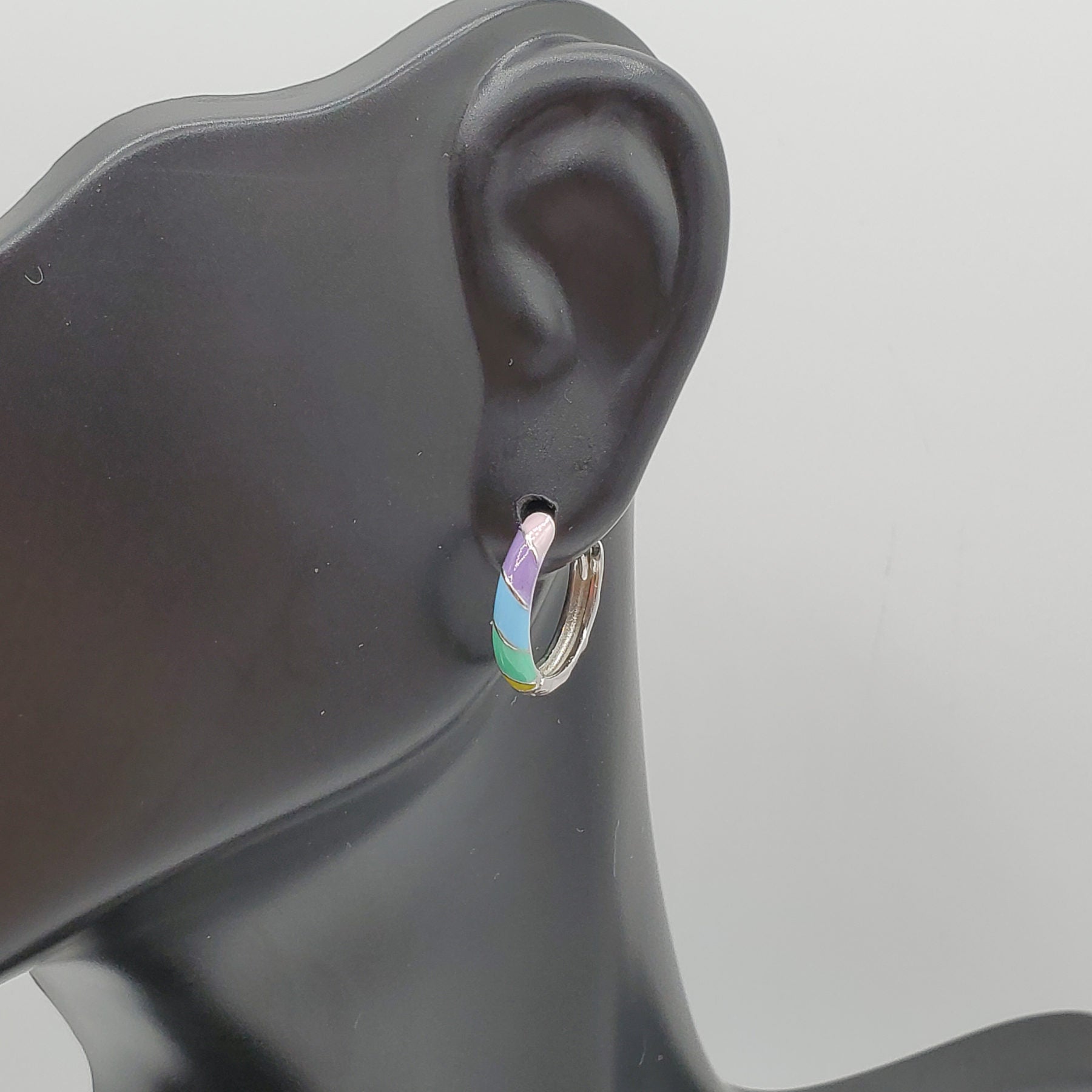 Rainbow huggie hoops .925 Sterling Silver with multi colored enameled accents. Hoop is 13.5mm in diameter.