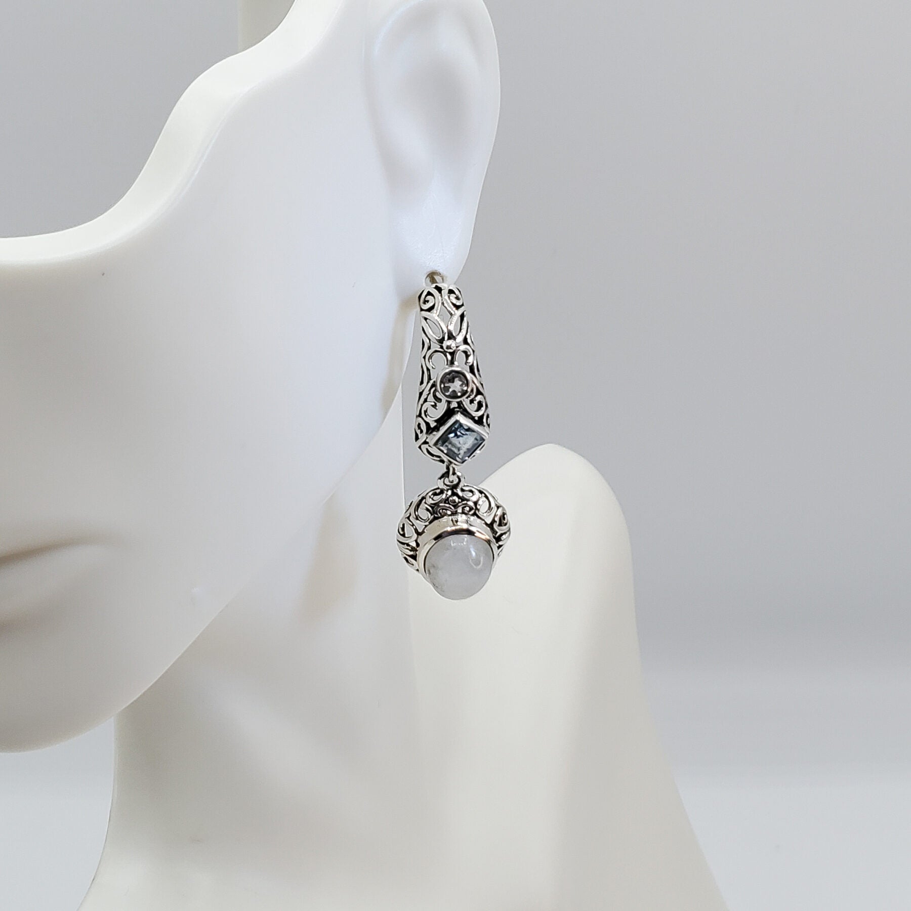 Rainbow moonstone dangle earrings in a .925 Sterling Silver filigree accented with aquamarine square and round stones. These earrings make any style of dress elegant