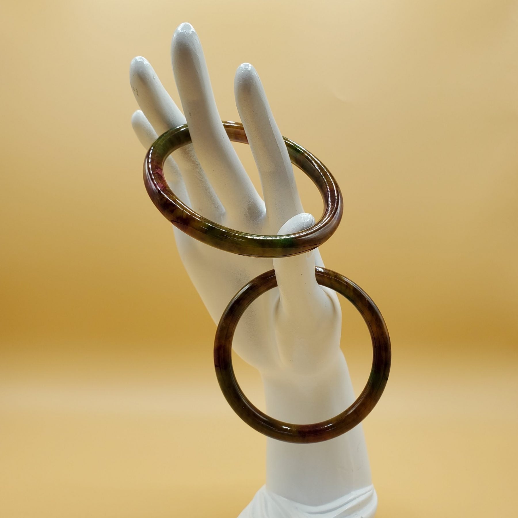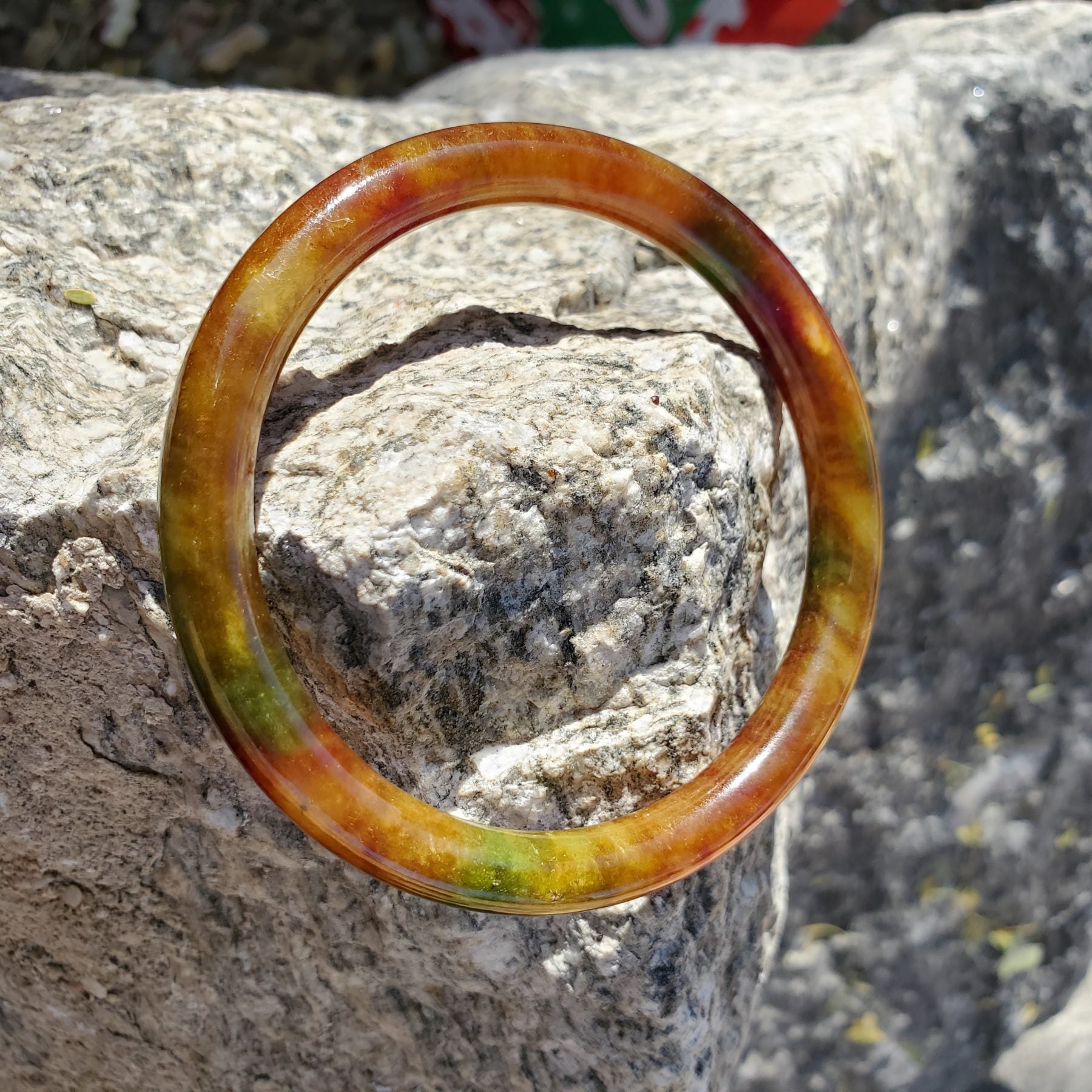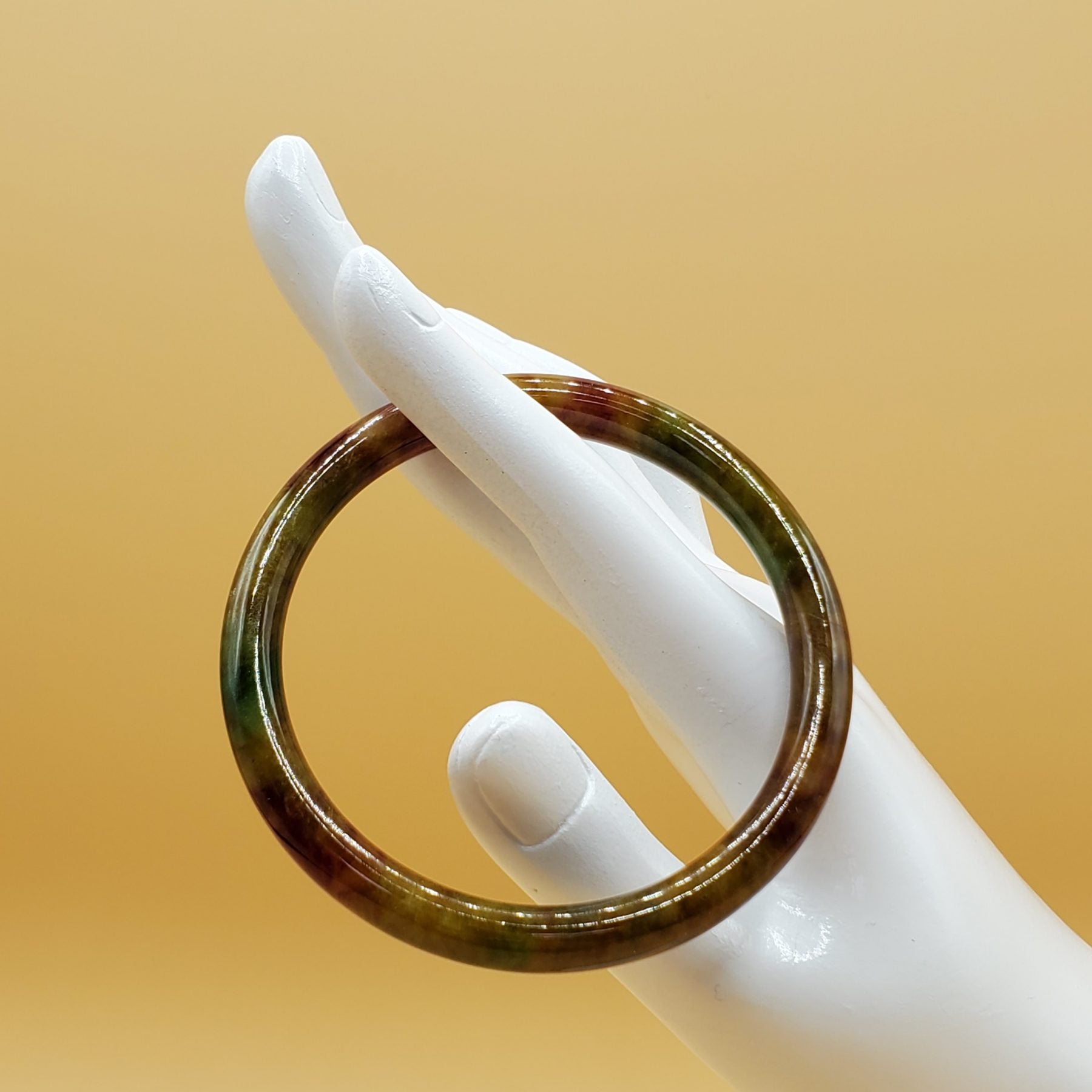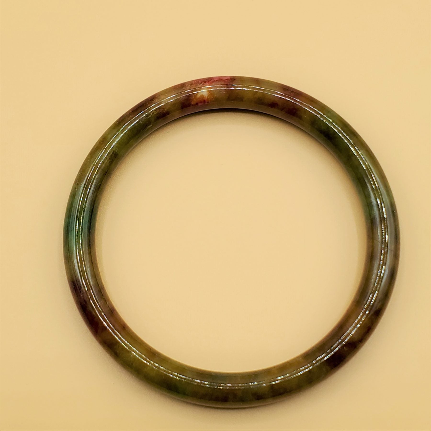 Very rare 7" genuine Jade multi color bangle with red, green and brown jade. Truly a unique piece due to the color variations it will go with everything in your wardrobe. Color with each individual bangle varies slightly due to its natural nature.