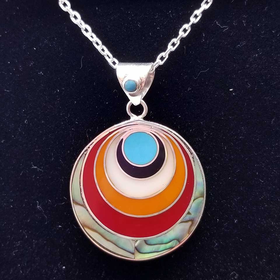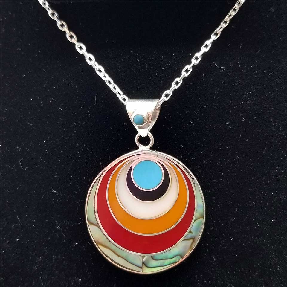 Retro style enameled pendant with inlays of abalone, turquoise, garnet, orange and moonstone mimics the jewelry of the 70's. It is a fun style that can quickly turn into your go to jewelry style for everyday. The .925 20" silver chain is included with the pendant.