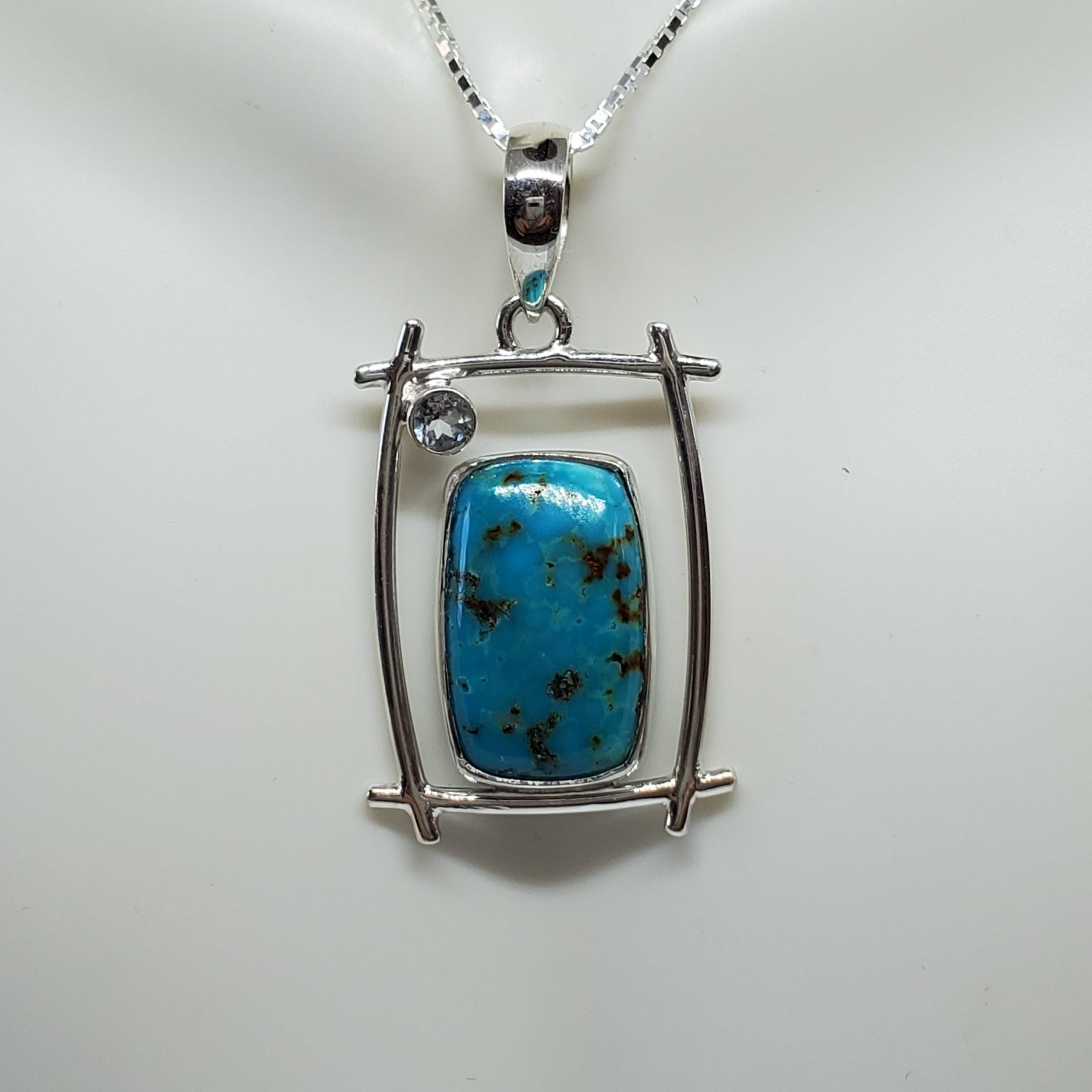 35mm square Shattuckite Pendant set in .925 Silver design with an accent jewel of Blue Topaz. Chain shown is included with purchase.