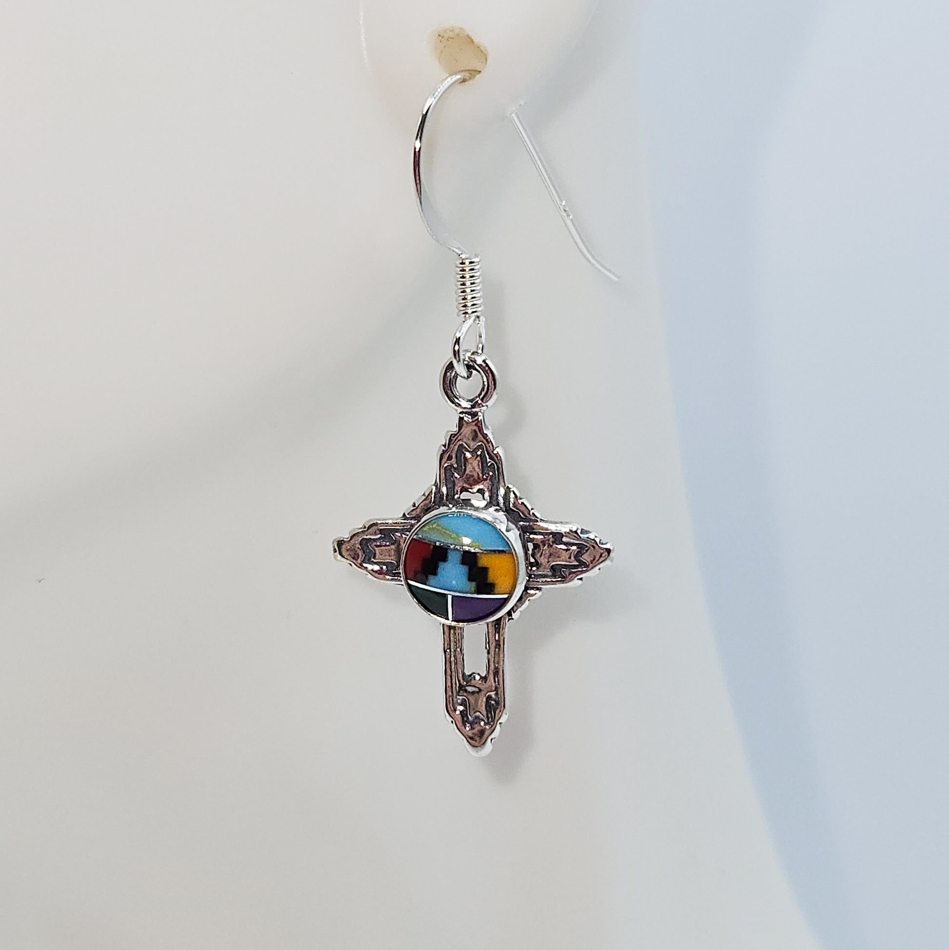Southwestern Cross dangle earrings accented by matrix turquoise