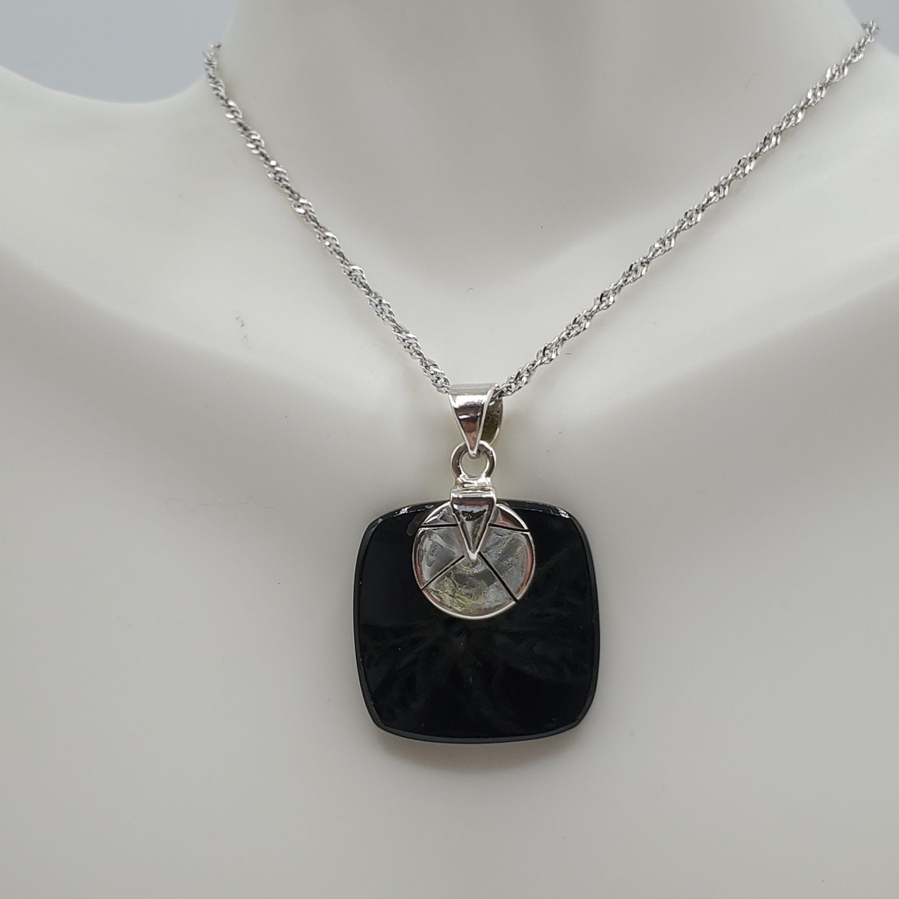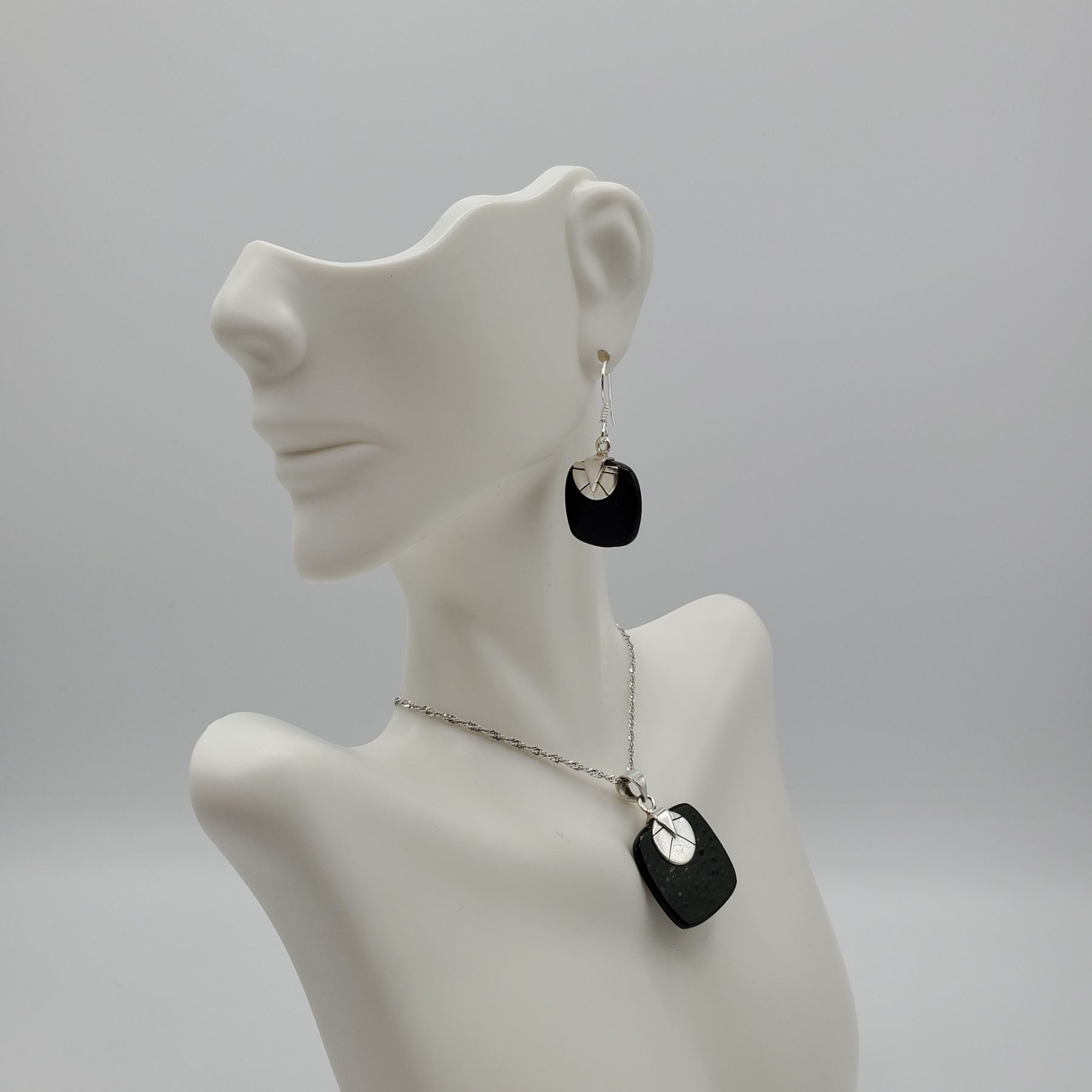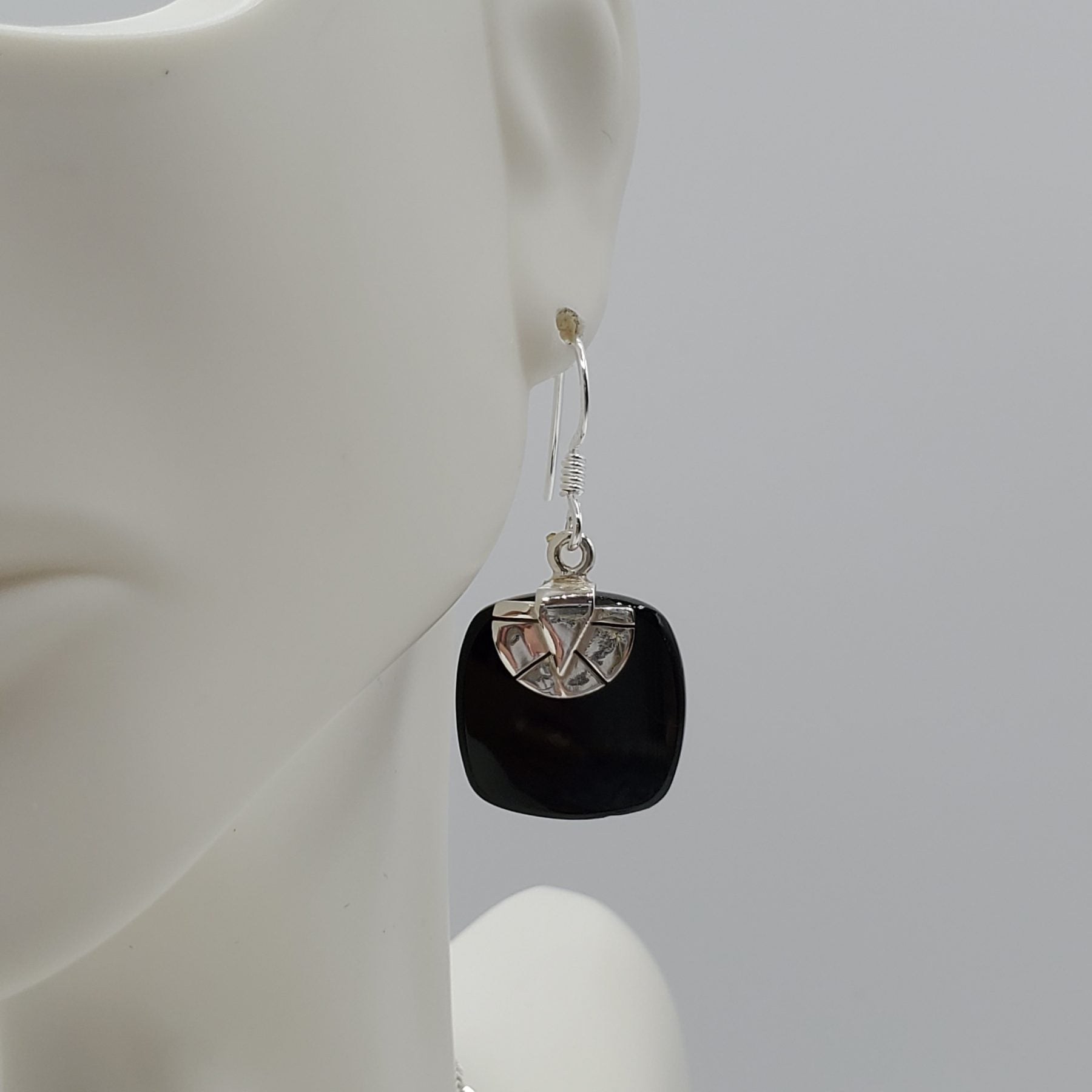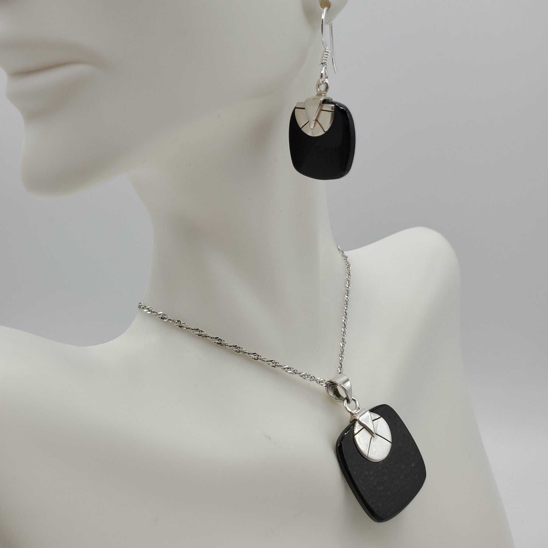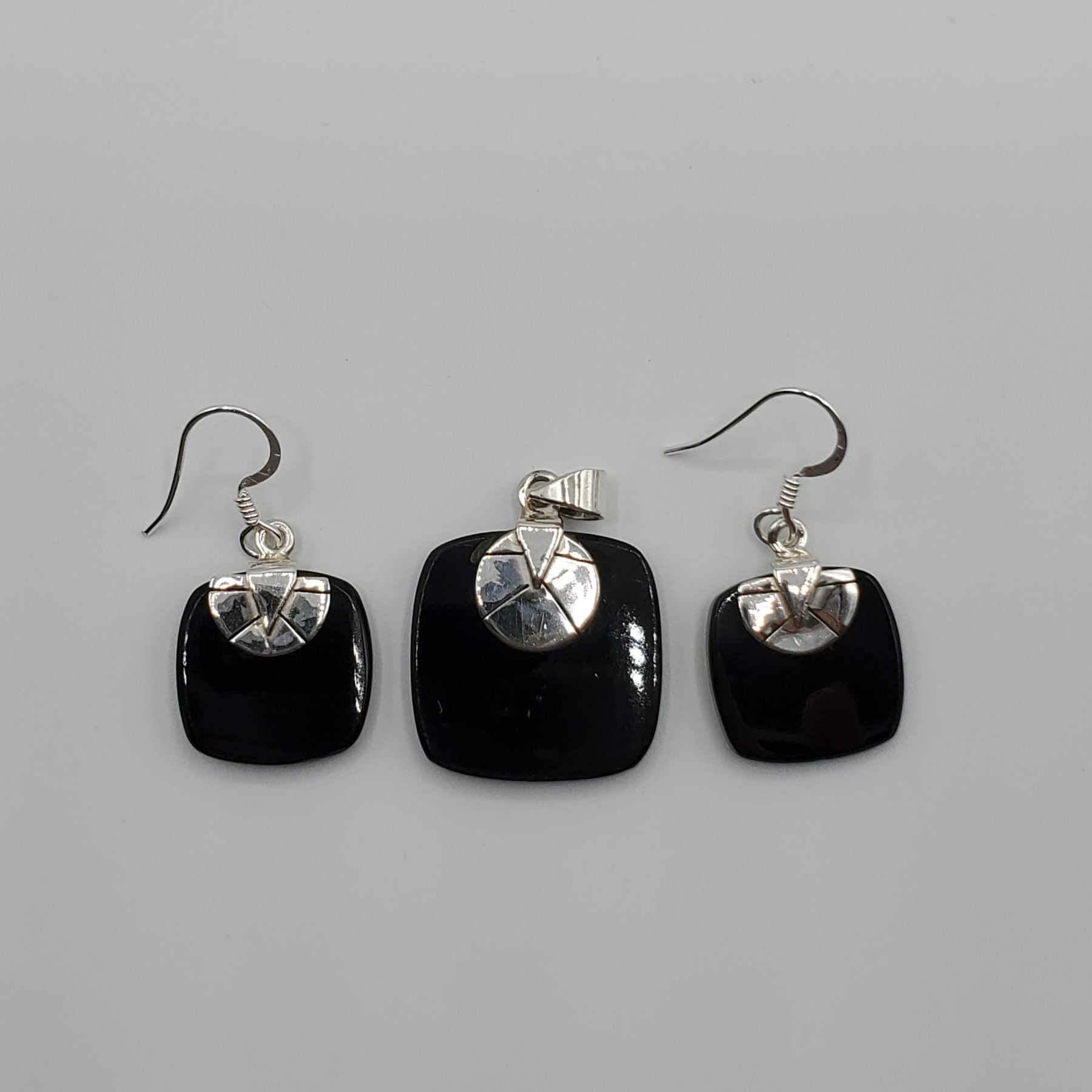 Sterling Silver Black Onyx pendant and earring gift set. Chain shown is not sold with set but can be purchased separately it is item 334 in this inventory. Pendant is 1.4" in L and earrings are 1.3" L