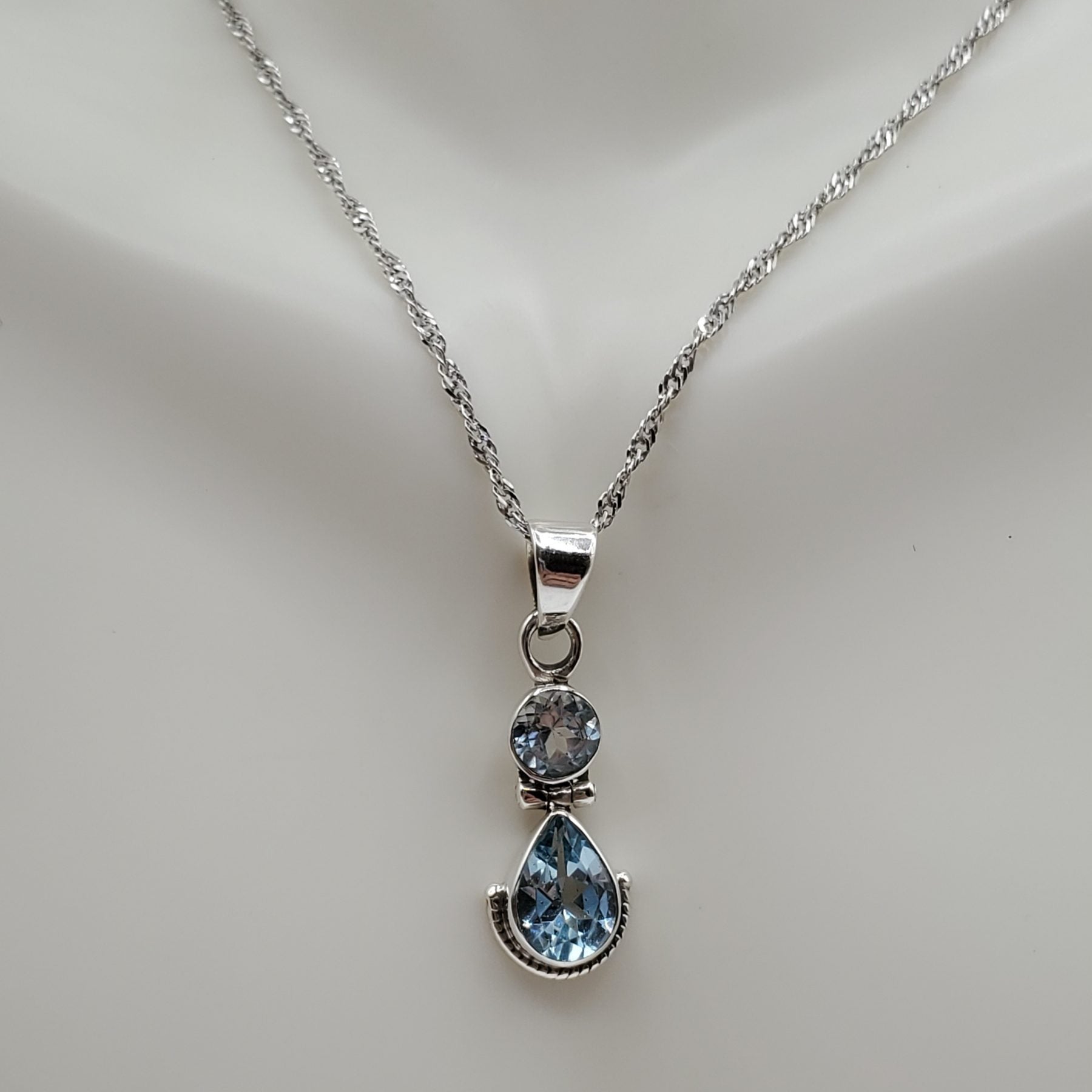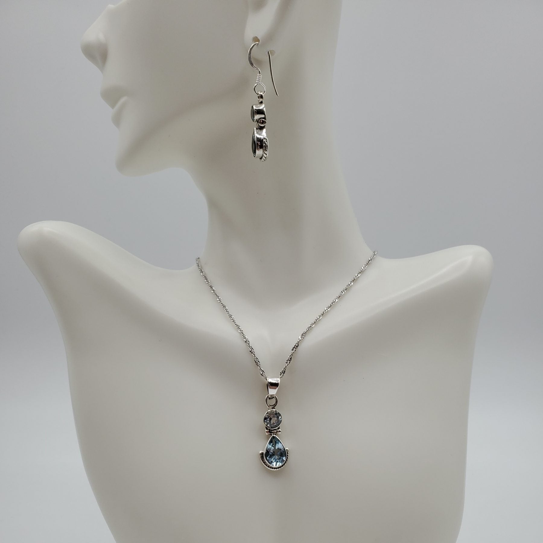 Sterling Silver Blue Topaz pendant and earrings gift set. Chain shown is not sold with set it is item 334 in this inventory. Pendant is 1.2" L and Earrings are 1.3" L