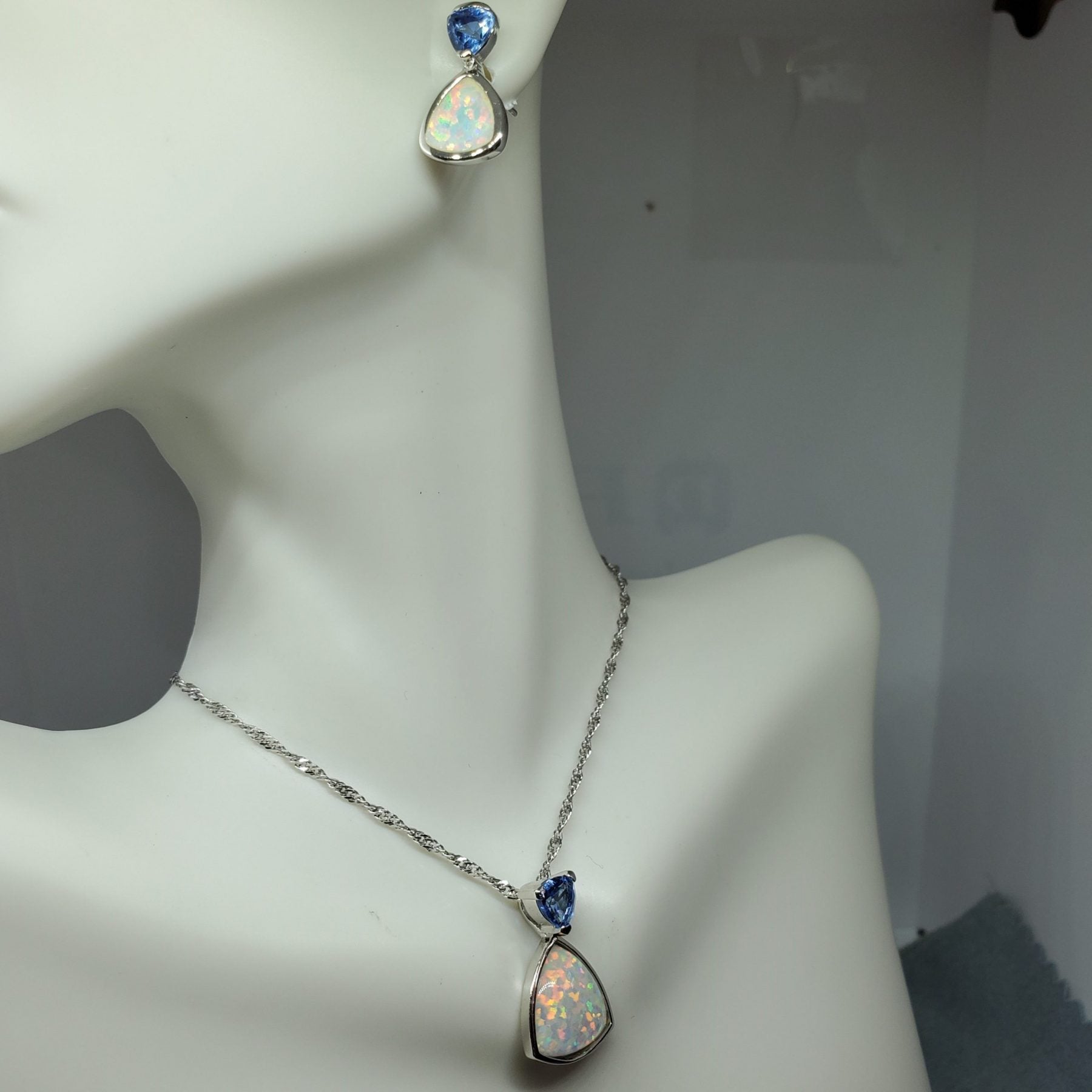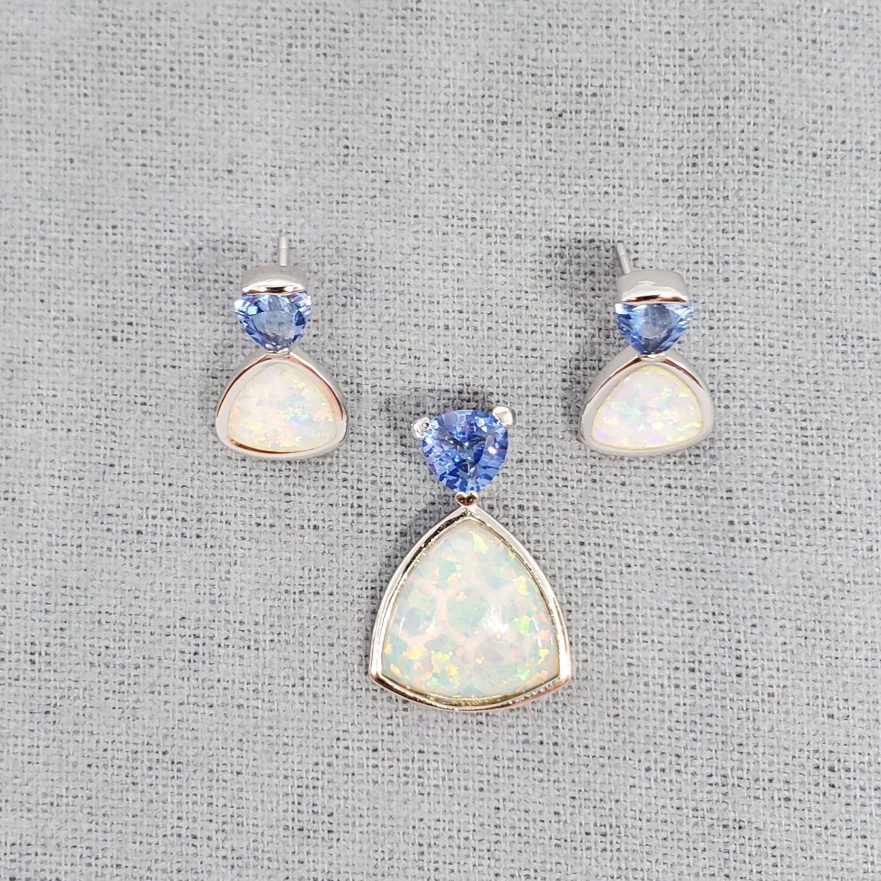 Trillion Shape White Opal and Tanzanite accented Sterling Silver Pendant (.89" L) and Earring (.55" L) Gift Set. Chain shown not sold with gift set it can be purchased separately it is item # 334 in this inventory.