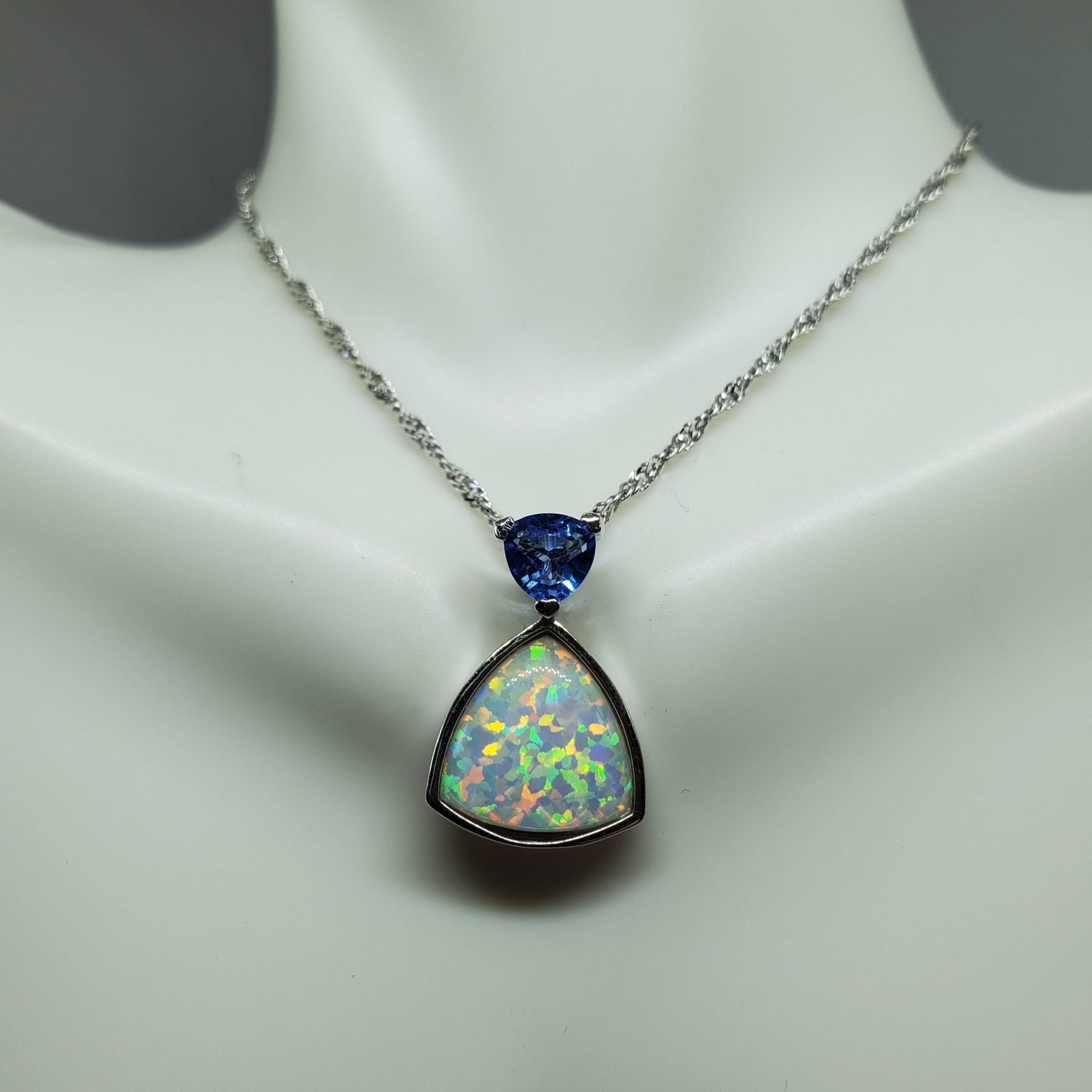 Trillion Shape White Opal and Tanzanite accented Sterling Silver Pendant