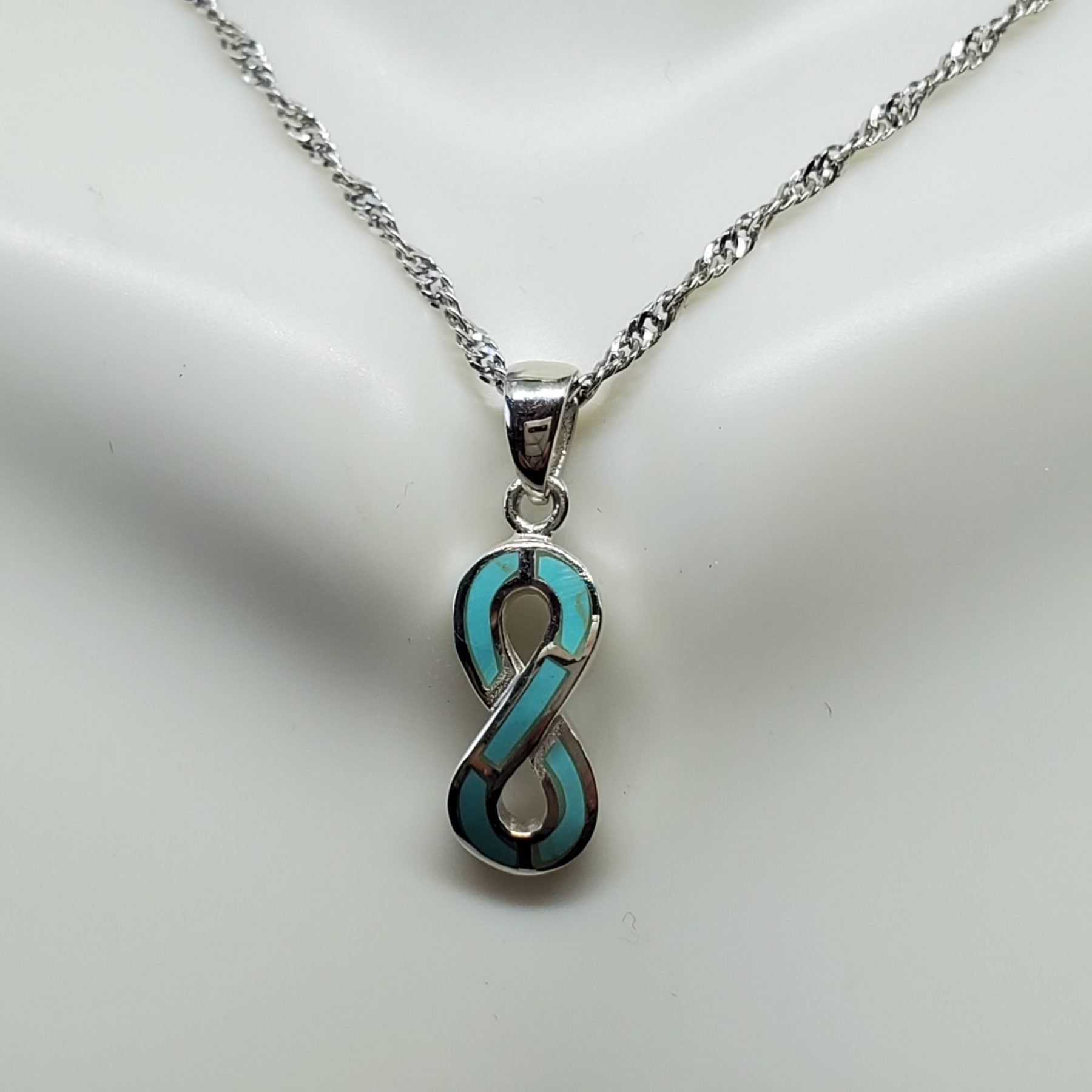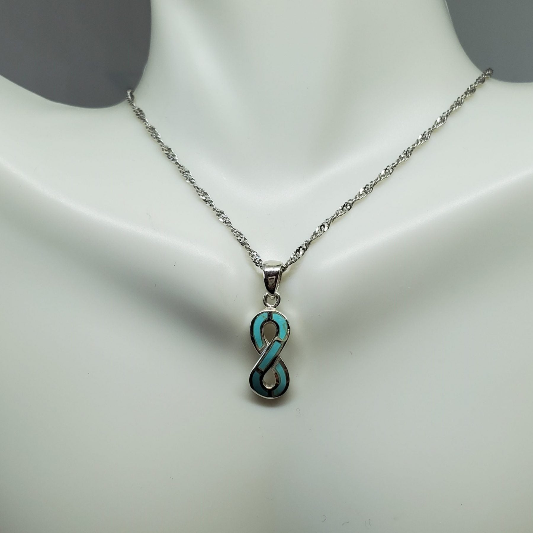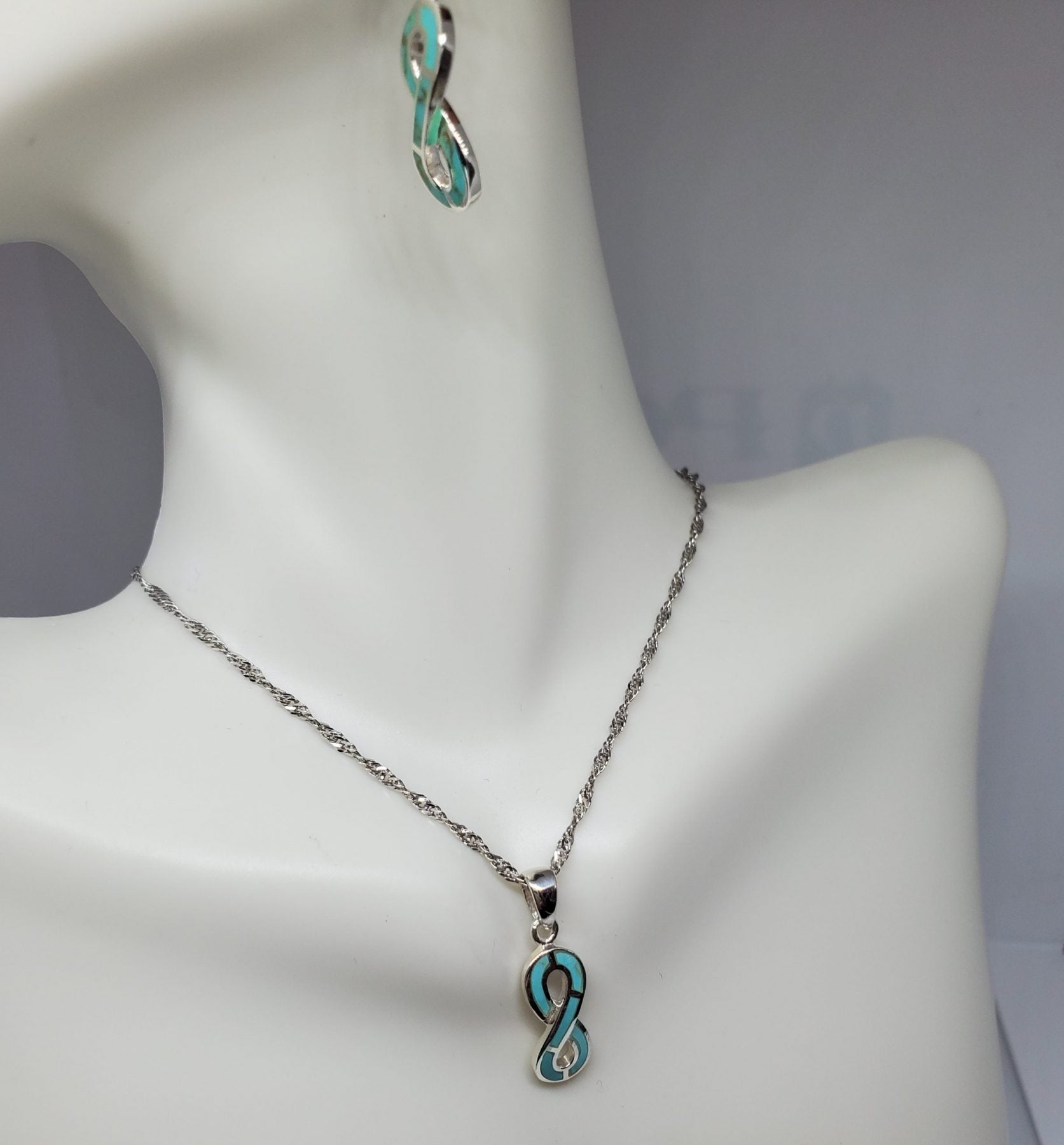 16mm Turquoise Infinity Symbol .925 Sterling Silver Earring and Pendant sold with silver chain (chain shown not sold) Chain Shown is Item #334 in this inventory