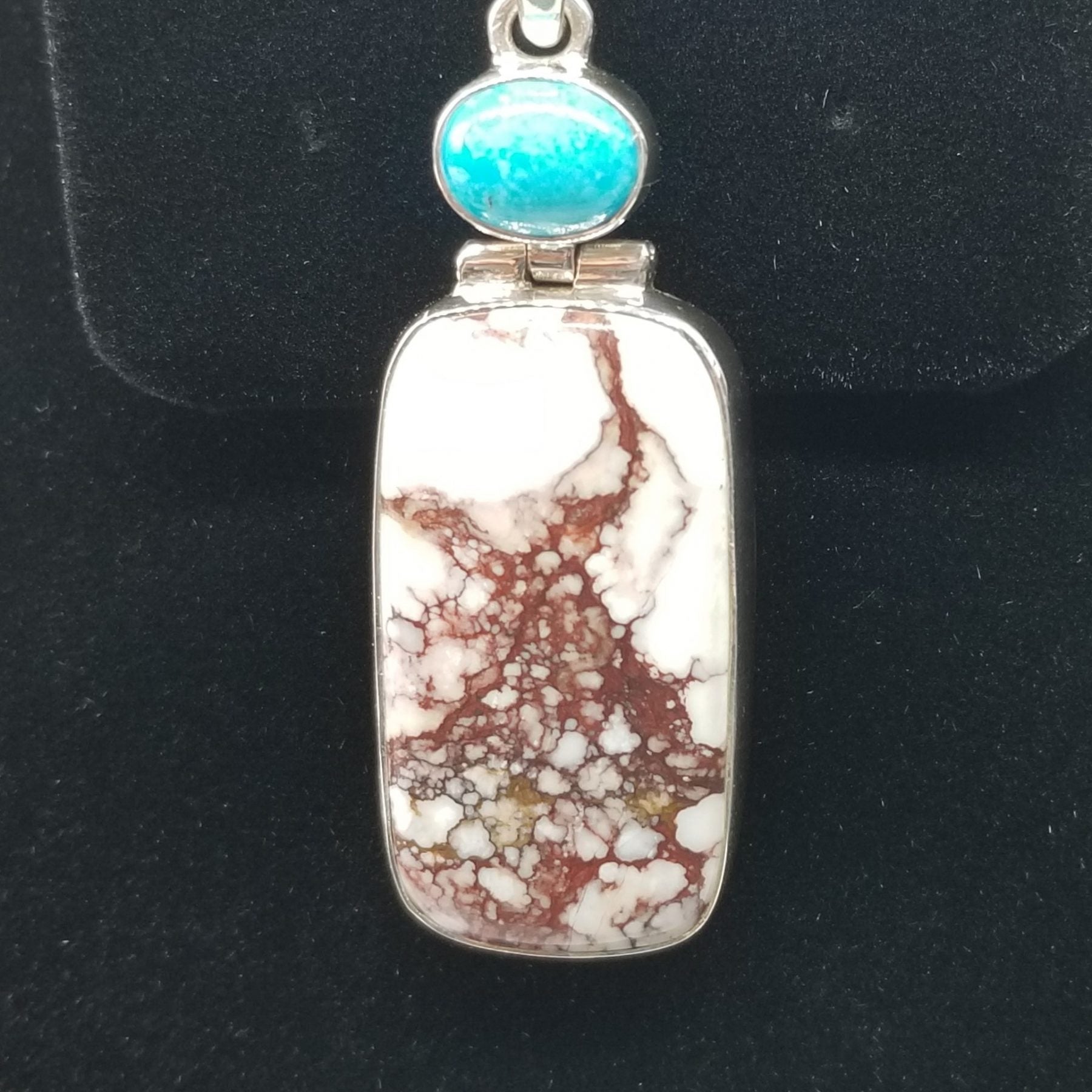 56mm in length Wildhorse Agate pendant accented with a 8.8mm oval turquoise cabochon.