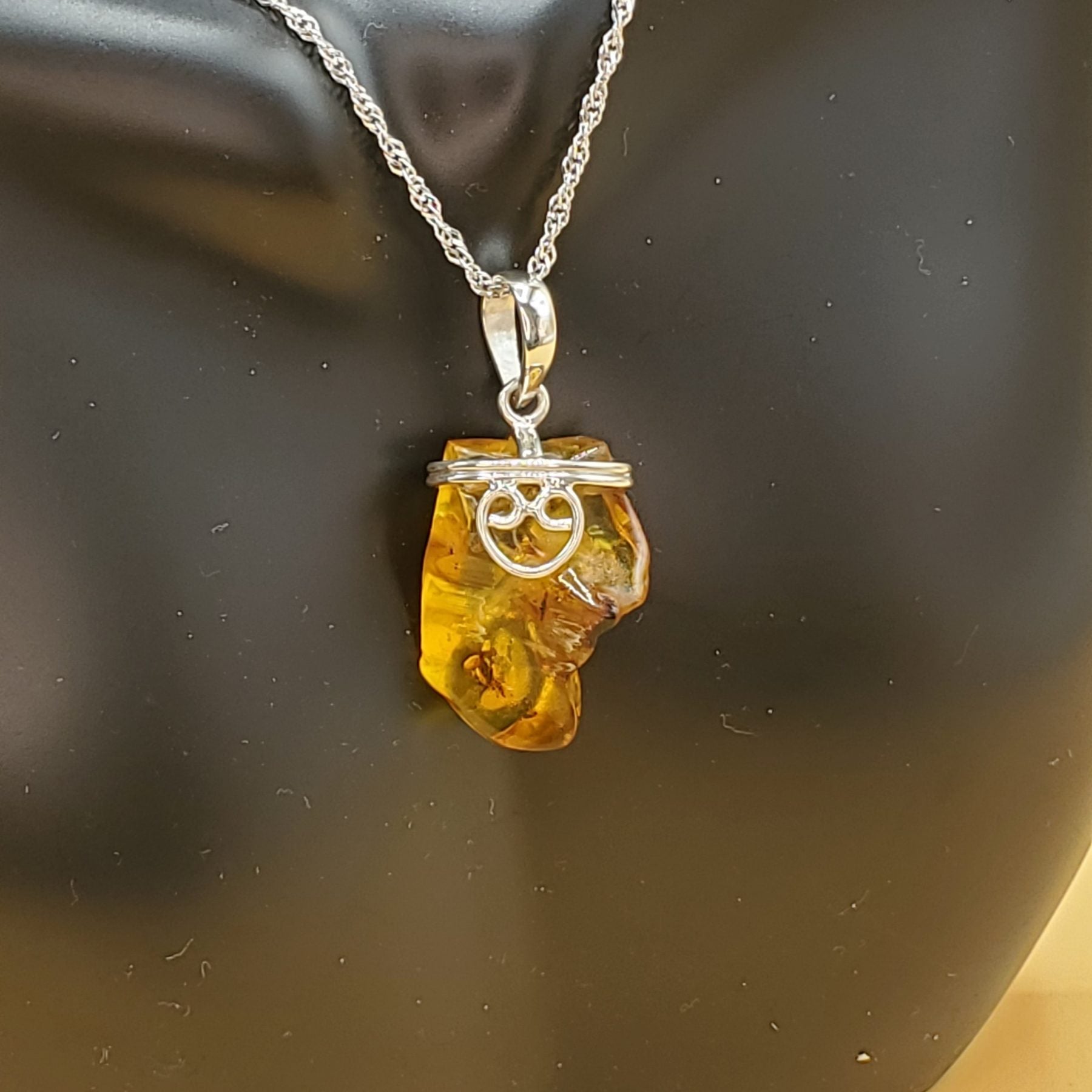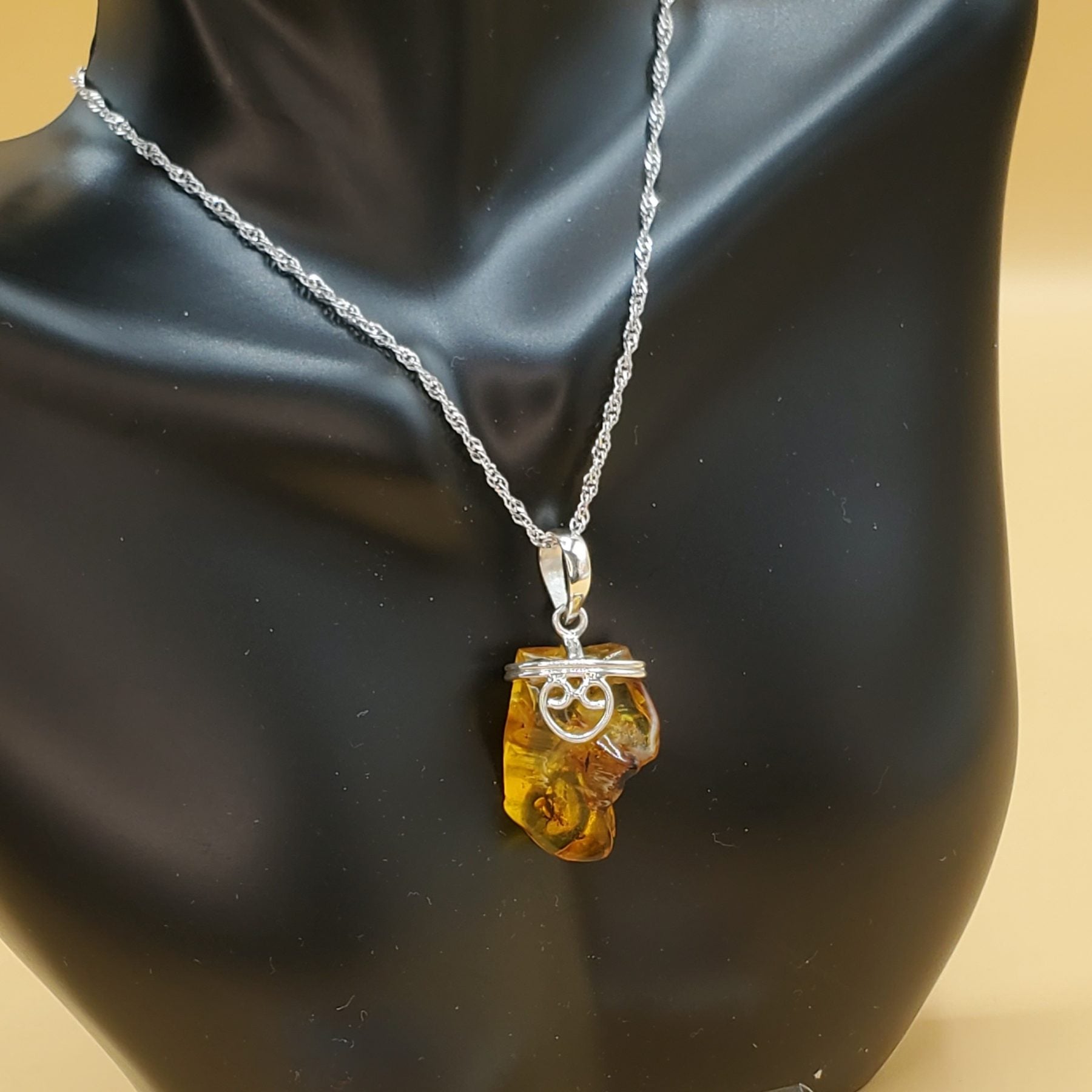 Yellow Amber Pendant accented with Sterling Silver filigree heart design. The pendant is 1" in length. Chain Shown is not sold with pendant but is item #334 in this inventory.