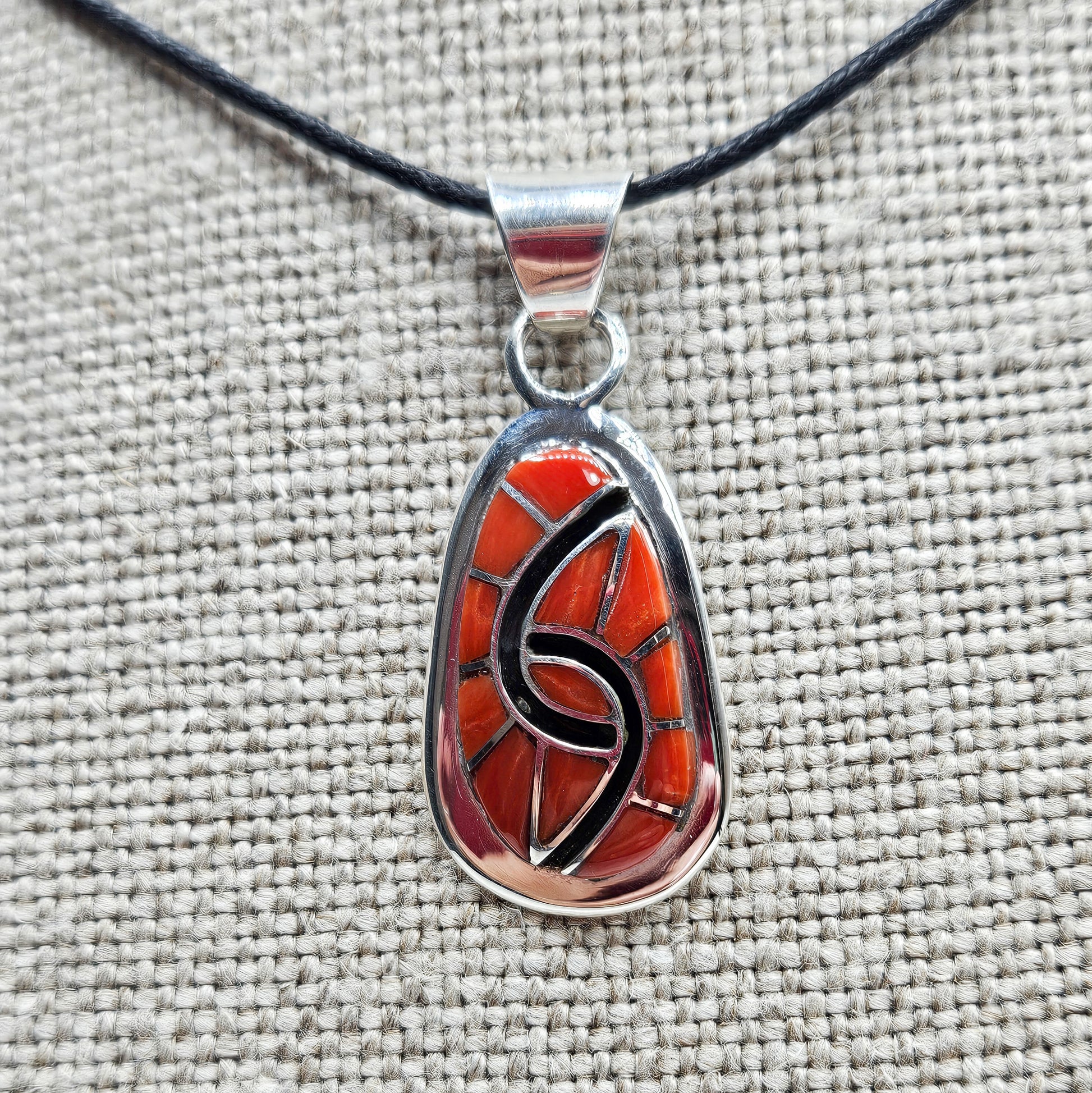 Zuni inlay pendant known as the hummingbird design using oxblood coral. The pendant is 43mm in length and 18mm in width. An 18" sterling silver box chain is included with pendant in the purchase price. This is a signed pendant by Amy Wesley.