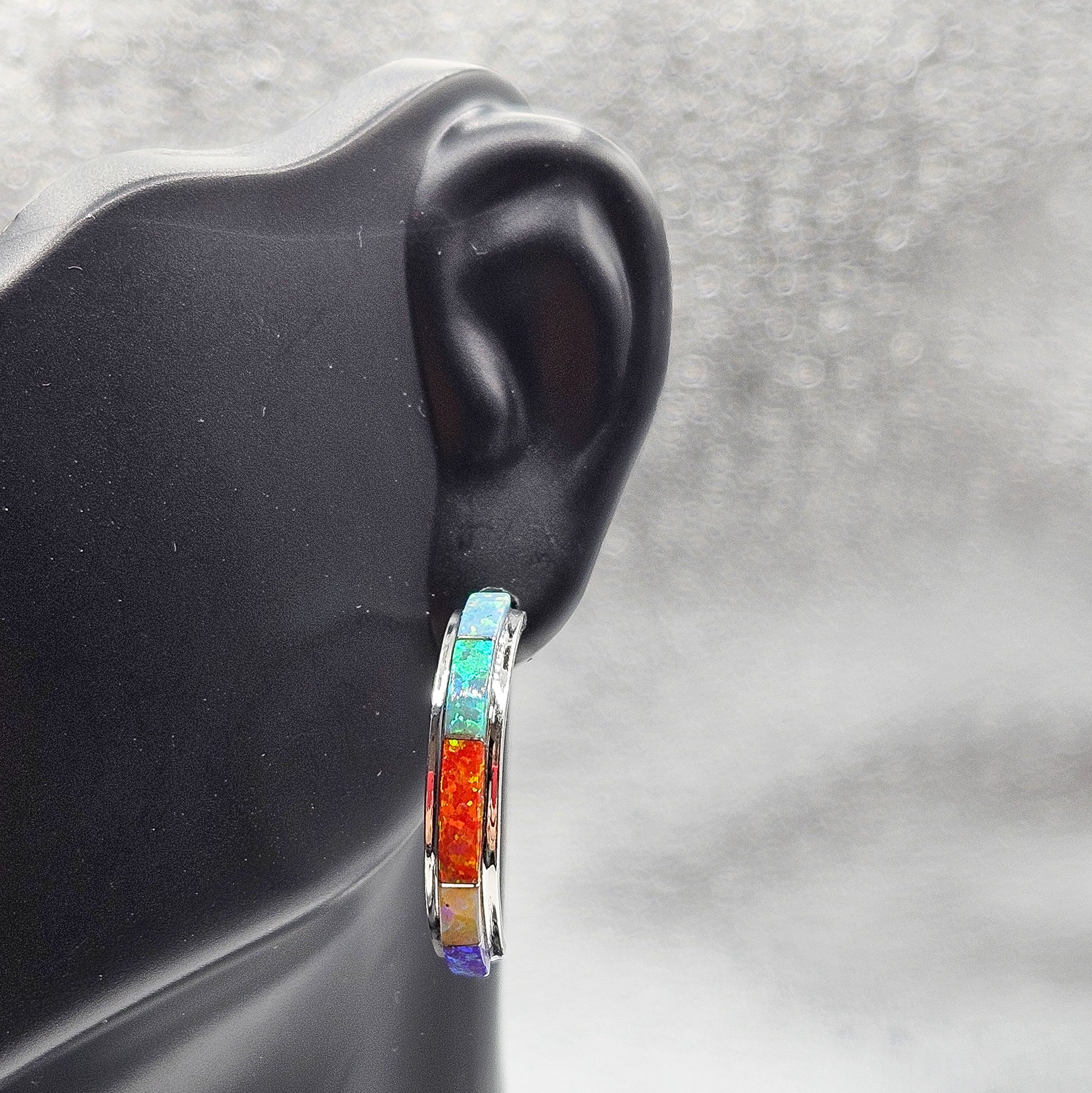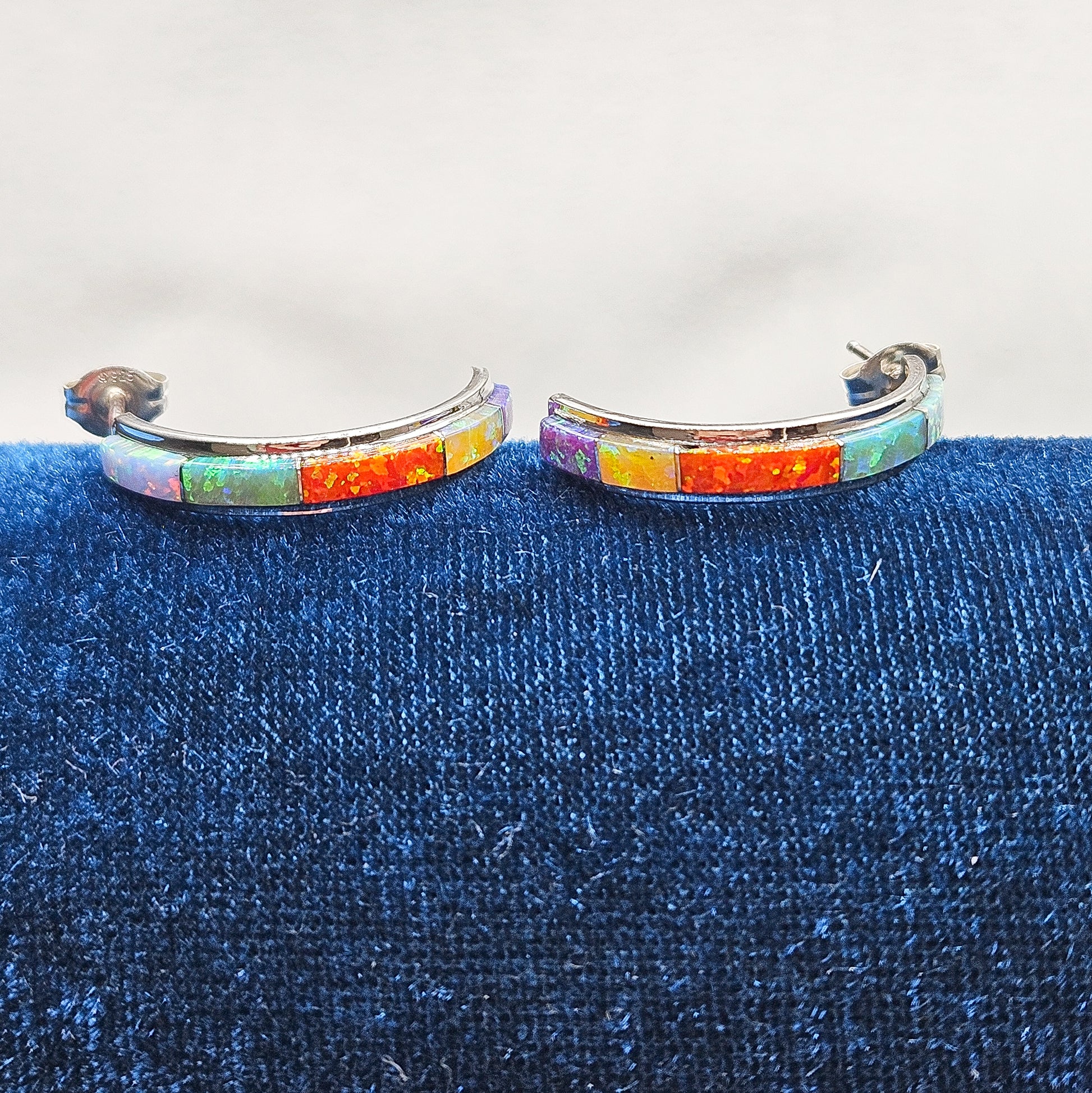 Zuni opal inlay half hoop earrings measuring 23mm in length. Sterling silver base with mixed color inlay of opals. These earrings are one of a kind with no two exactly the same and created by indigenous artists.